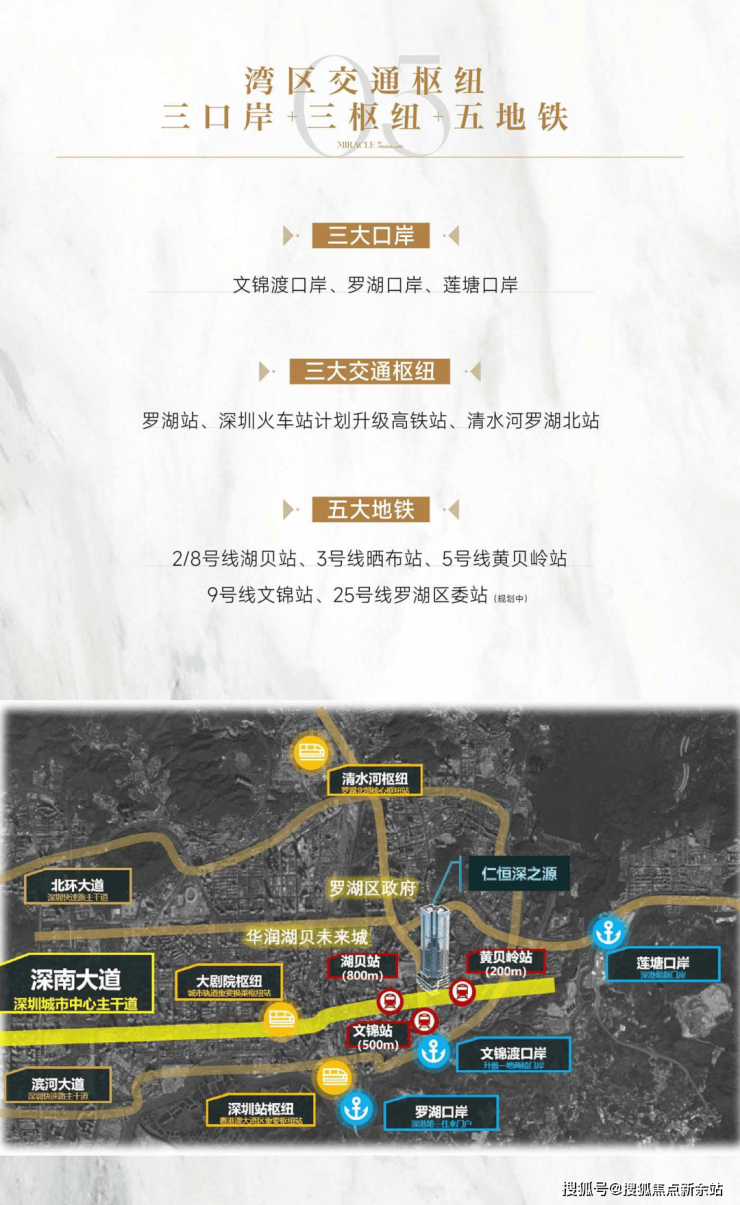 交通网络的发达程度令人惊叹。项目周边被5条地铁线路环绕,包括2/8号线湖贝站、3号线晒布站、5号线黄贝岭站和9号线文锦站,步行约200米即达黄贝岭站。同时,项目毗邻文锦渡、罗湖和莲塘三大口岸,约50分钟即可从罗湖直达港岛核心区,真正实现了深港生活的无缝切换。