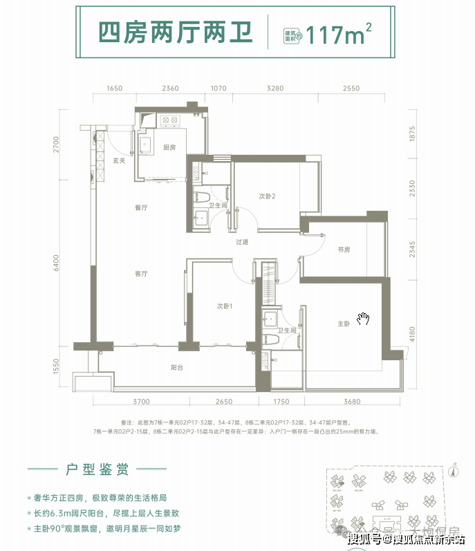 二期:7栋1单元为商品房住宅48层,7栋2单元为商品房+安居房混搭住宅49层,8栋1单元为商品房+安居房+公共租赁用房混搭住宅47层,8栋2单元为商品房住宅47层,8栋3单元为商品房住宅46层;商品房有1507户,其中1419户为建筑面积90平以下刚需户型;