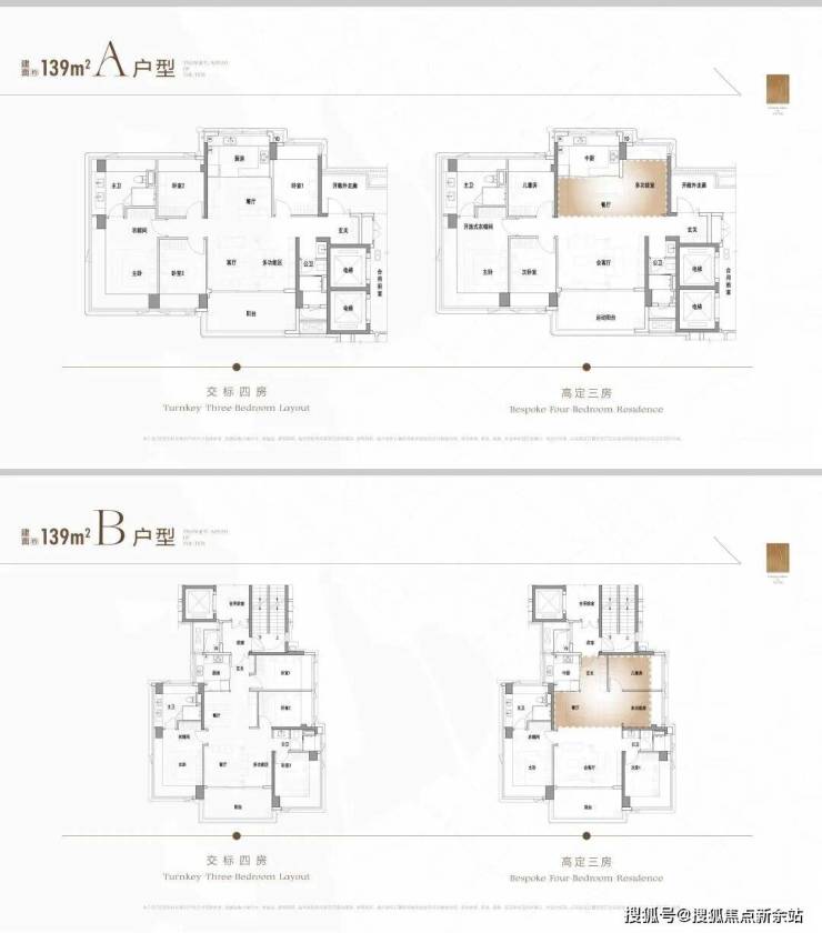 139m²,三/四房,2梯3户,塔楼;采用品字形结构,巧妙化解了传统塔楼的弊端,中间户也能实现三面采光,端头户则保持通透,在视野与功能性上取得平衡;
