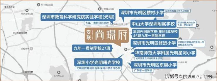 不仅如此,安联尚璟府周边2公里范围内,还拥有深圳小学光明曙光学校、东周小学、中山大学深圳附属学校等超9所小学,深圳实验光明学校、华夏中学、光明区高级中学等超8所中学护航,出家门入校门,全方位呵护孩子3-15岁的成长。