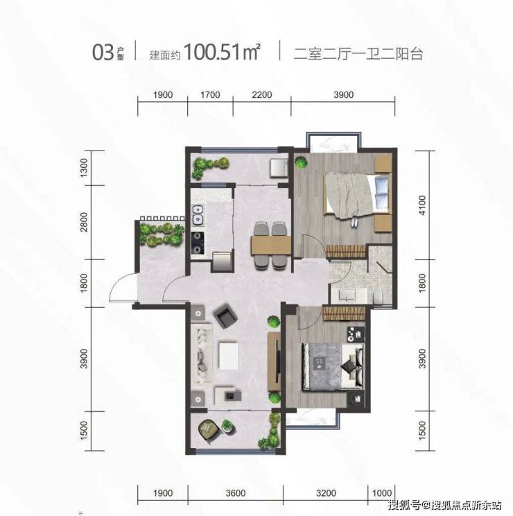 一室一厅一卫一阳台03户型丨建筑面积约100.51、100.73㎡