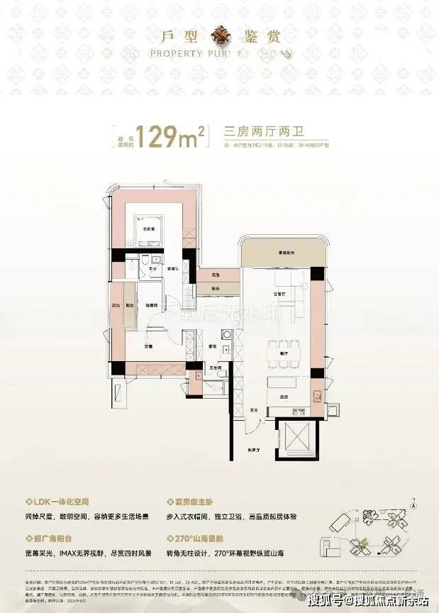 129㎡的4房2厅2卫,设计的是竖厅格局,尊享独立电梯入户,LDKB一体化设计,动静分区,主卧270°无柱转角全景舱,L型厨房+岛台设计,公卫三段式干湿分离,得房率约105%(包含赠送),东北朝向看一线梧桐山景观。