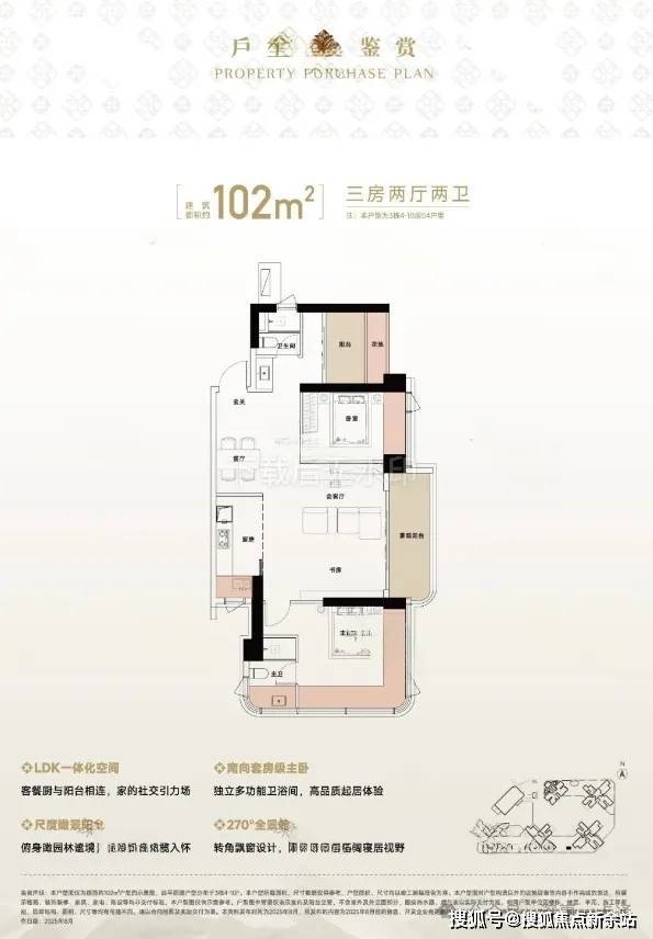 102㎡的3房2厅2卫,设计的是竖厅格局,LDK一体化设计,四开间朝南,主卧270°全景舱,L型厨房,公卫三段式干湿分离,得房率约94%(包含赠送),东南朝向看海景视野。