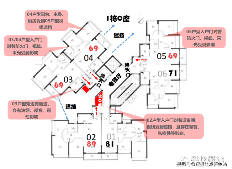 ④03户型靠近烟道,可能受到气味、噪音影响。
