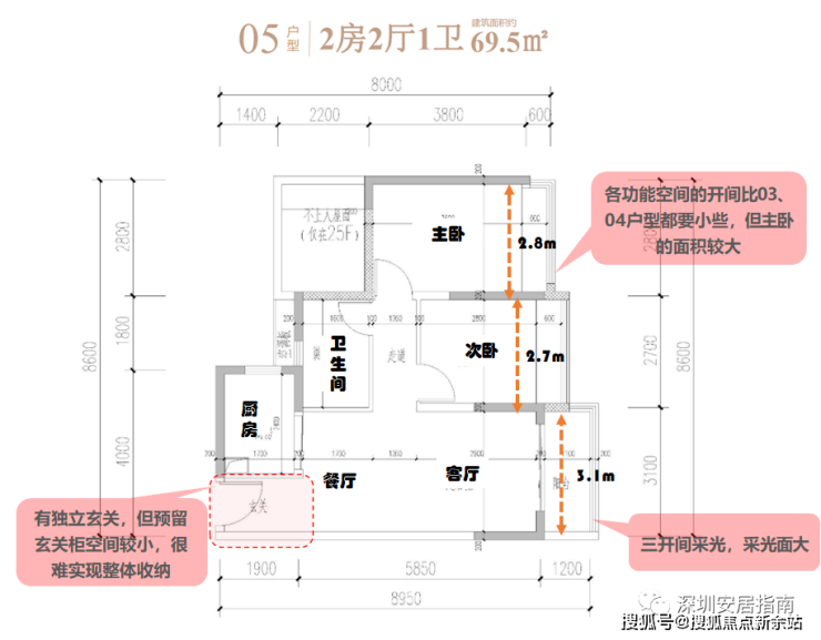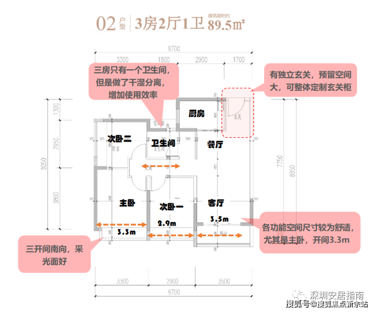户型三:02户,89.5㎡(套内69.8㎡),竖厅设计。