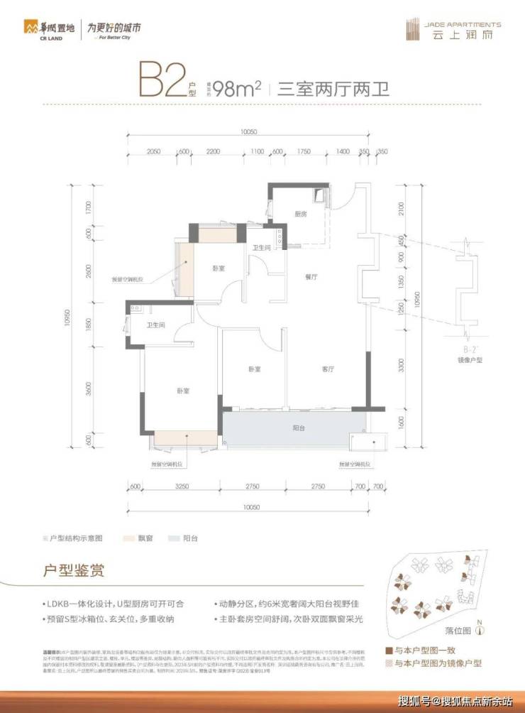 98㎡的3房2厅2卫,B1户型,设计的是横厅南北通透格局,客餐厅5.9米开间,LDKB一体化,3个卧室分别做到了3.25米/2.65米/2.5米的宽度,U型厨房,公卫三段式分离设计,得房率81.23%(不含赠送),阳台主朝东南向。