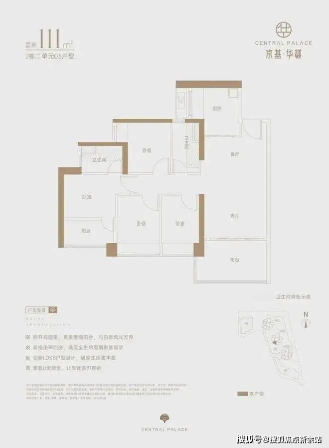 仅2栋2单元05户型才有,设计的是经典竖厅格局,LDKB一体化,动静分区,四开间朝南,U型厨房,卫生间干湿分离,得房率约73%(不含赠送),阳台西南朝向。