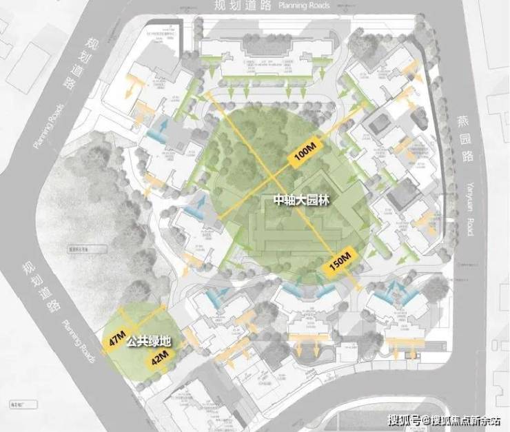 其延续和樾府「一半公园一半城」的基因,以围合式的设计手法,在天河中轴之上,呈现建面约1.5万㎡园林,相当于约150米*100米。