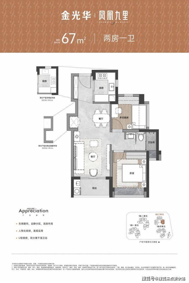 金光华凤凰九里开盘时间为2023年11月,推出1栋1/3单元,共430套房源,面积68-106㎡,2-4房,金光华凤凰九里得房率达到80%,加上赠送面积约90%,还是很不错的,目前在售产品折后总价区间,67m²2房1卫:215-238万,74m²3房1卫:230-259万,85m²3房2卫:270-318万,106m²4房2卫:350-425万,67平米两房0首付5万定金即可上车,月供30年8900左右每个月!74平米0首付定金5万三房月供9800上车