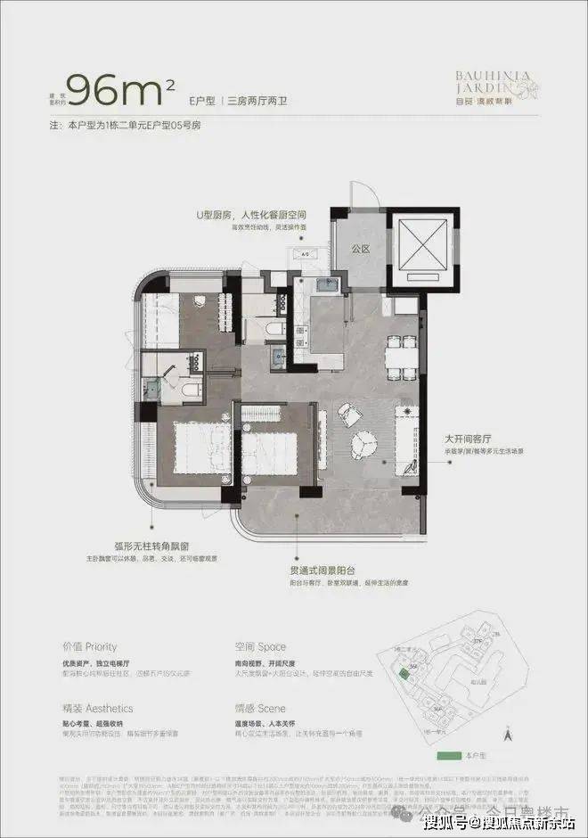 四房为主,多种厅式可选;大面积的飘窗利用,采光面大、实用率高;转角处使用弧形玻璃且都是无柱设计,景观视野佳;