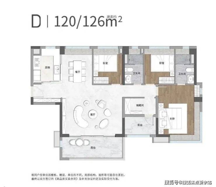 建面约120/126㎡单位,LDK客餐厨一体的设计更加出众,全屋除了厨房,包括卫生间在内的所有空间都带飘窗或者阳台。