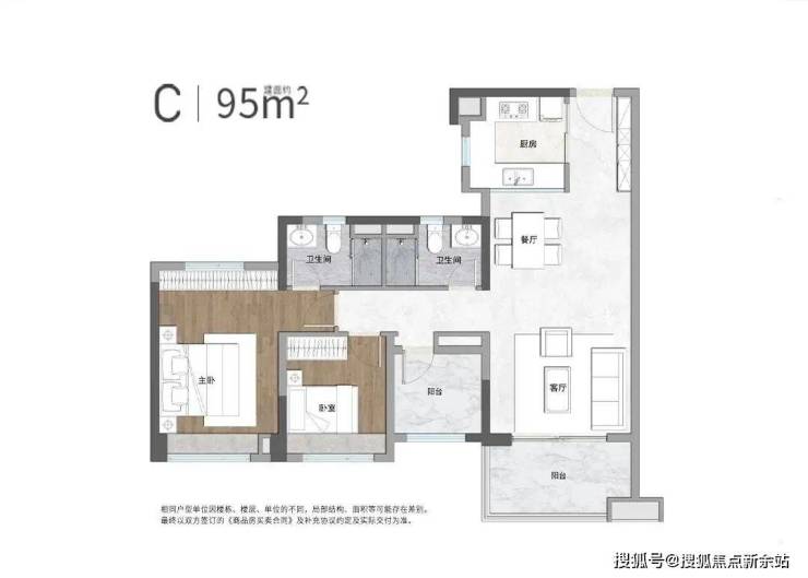 建面约95㎡单位,户型是经典的竖厅设计,客餐厅与卧室动静分离,灵动空间赠送一半面积。