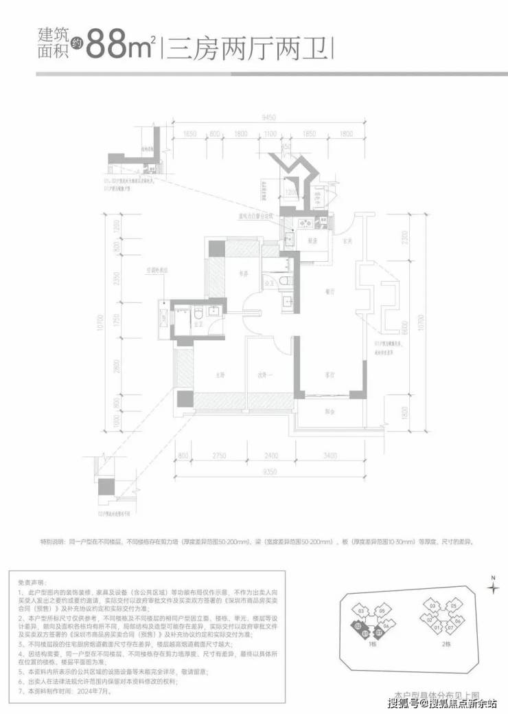 88㎡的3房2厅2卫,设计的经典竖厅格局,客厅3.4米开间,得房率约:95%(包含赠送),阳台进深1.8米,有西南或东南朝向。