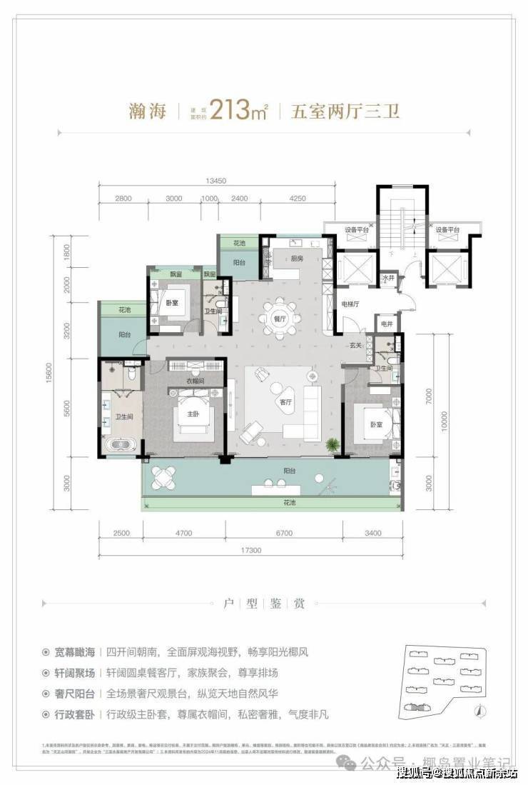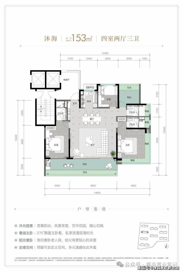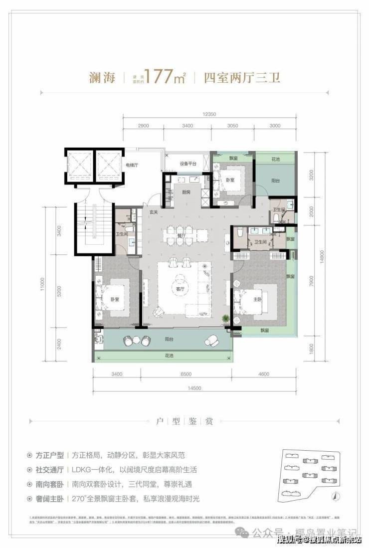 规划建筑面积约126-213㎡观海奢装大平层,约3.1米阔绰层高,部分户型创新设计270°全景飘窗主卧套、四开间朝南等,全成品高标奢装,营造全新舒居体验。