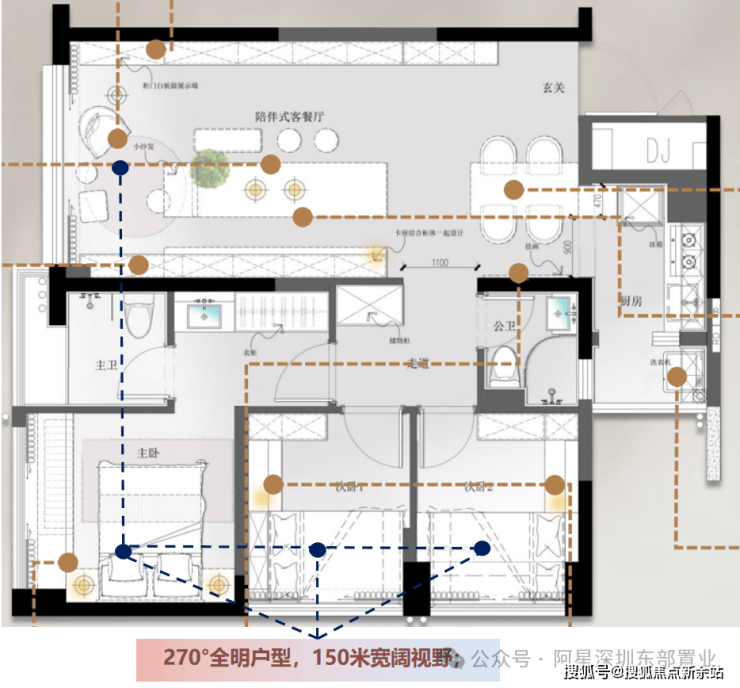 全能采光:270°多向采光,客厅主卧均西南朝向,全明户型设计