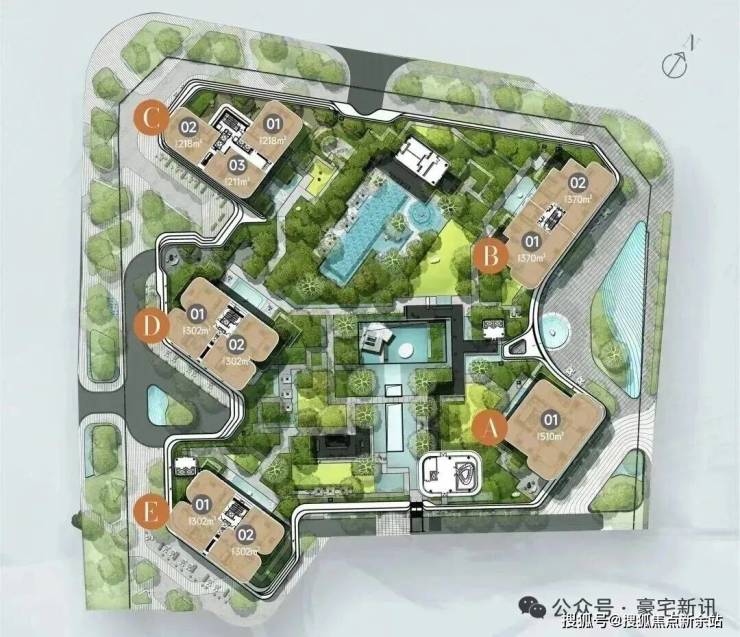 1E栋(1栋五单元)-43层:均为3梯2户,约302㎡,一层两户。