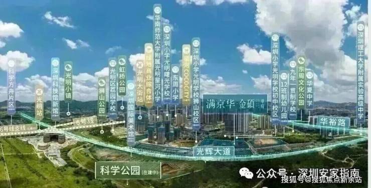 金硕臻府,由满京华集团开发,位于光明区光明中心区光辉大道与狮山三街交汇处,项目所在区域是光明规划最宜居,居住小区板块最大的片区,北侧靠近科学公园,东侧及南侧是深圳小学光明学校狮山校区及初中校区,距离最近的6号地铁线“光明站”约800米。