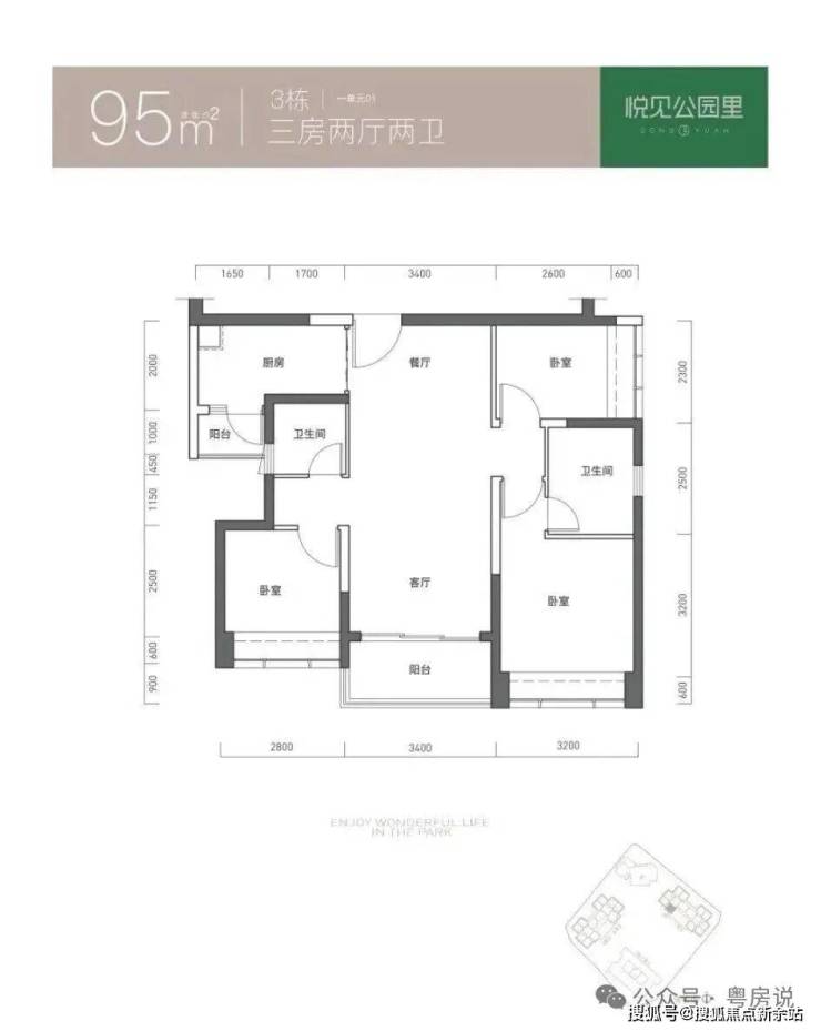 95㎡的3房2厅2卫,仅3栋1单元01户型,设计的是竖厅双龙抱珠格局,客厅3.4米开间,三开间朝南,3个卧室分别做到了主卧11.97㎡/次卧7.47㎡/次卧7.17㎡(实测面积,去掉墙体),L型厨房带1个生活阳台,公卫三段式分离,得房率73.71%(不含赠送),西南朝向。