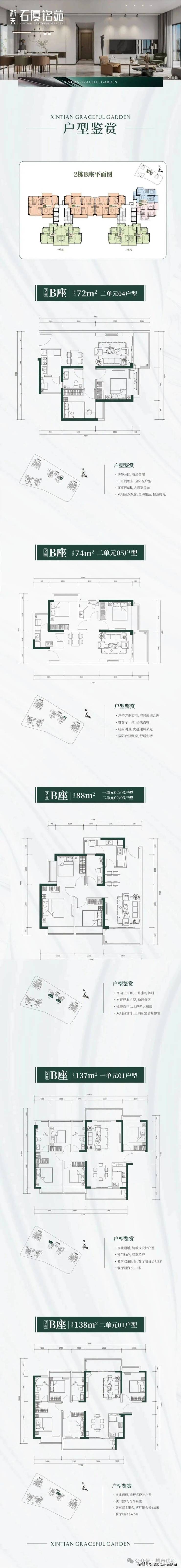 2栋B座一单元01、04户型、2栋B座二单元01户型:面积约为137-138㎡的4房2厅2卫;