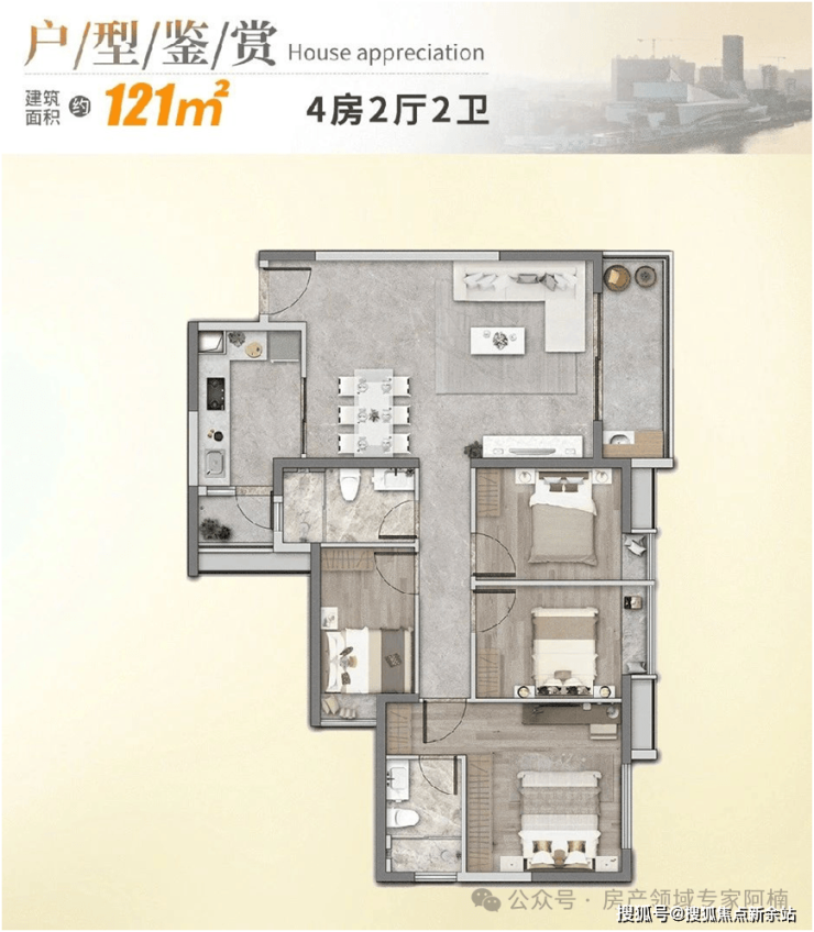 建面约121㎡天幕四房,东南朝向、四房朝阳,每间房都能感知江幕与阳光共舞的美妙。约4.5米的超阔客厅,巨幕采光面,也让每寸江岸时间都泛着优雅波光。
