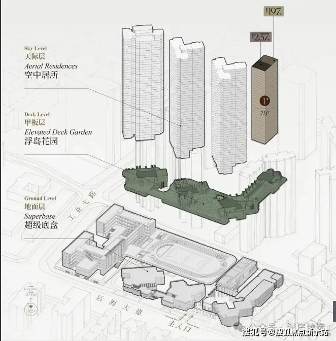 一个用心设计并且维护良好的公区,本身就是豪宅价值的重要组成部分。后海招商玺的公区设计,从回家的第一刻就开始体现独特美学。通过多家设计机构的协作,采用浮岛甲板的手法,打造了一个功能复合的“超级底盘”,将整个社区抬高12米,形成两个截然不同的空间氛围。
