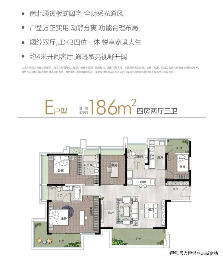 185㎡四房两卫,南北通透+双阳台,主卧套房带独立衣帽间,但公摊面积高达27%,性价比偏低。