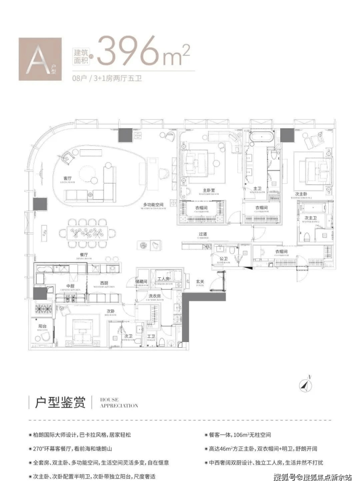 A户型:396㎡,3+1房2厅2厨5卫,西北向,全套房双主卧,次卧带阳台