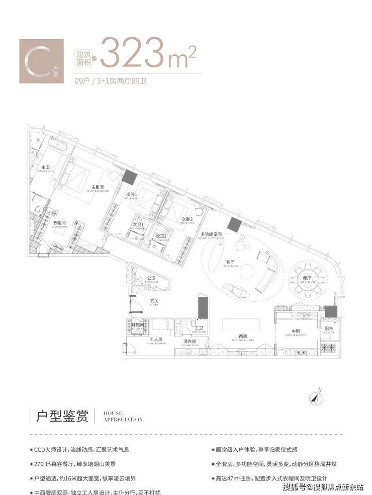 C户型323㎡,3+1房,2厅2厨4卫,东北向,山景,全套房。