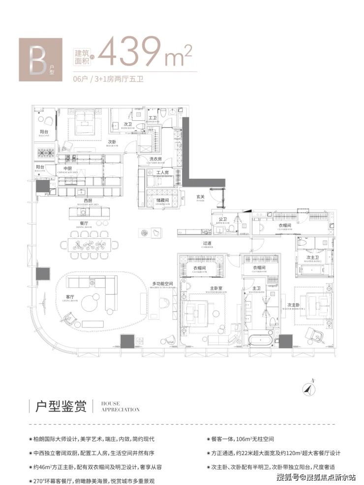 B户型439㎡:3+1房,2厅,2厨,5卫,西南向,全套房双主卧,次卧带阳台