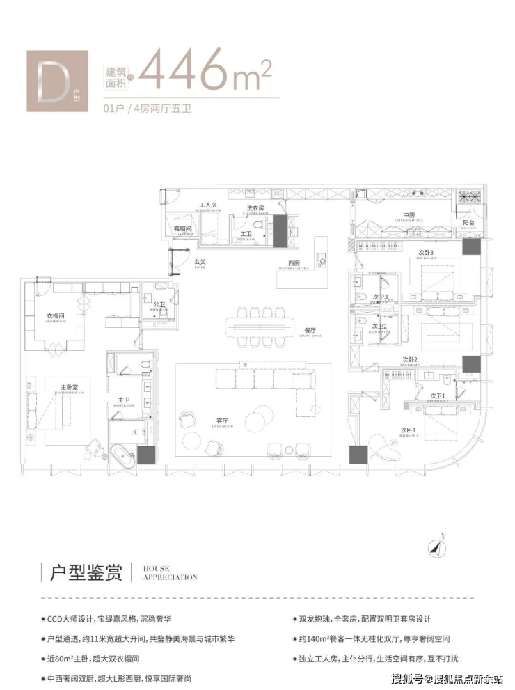 D户型446㎡:4+1房,2厅2厨5卫,东南向,全套房设计。