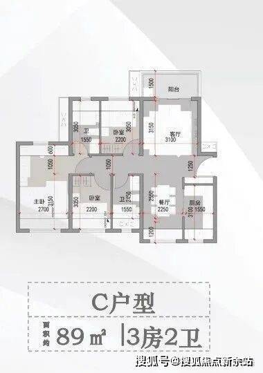 C户型 面积约89平方米 3房2卫