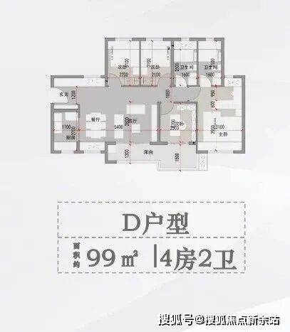 D户型 面积约99平方米 4房2卫