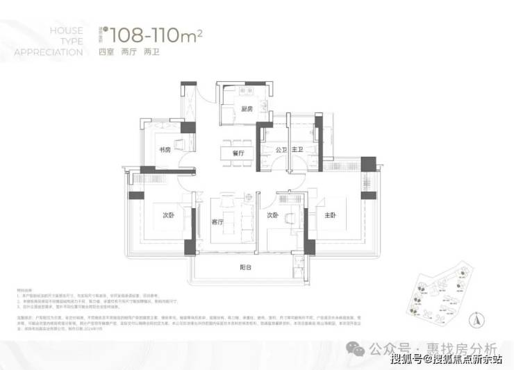 108-110㎡的4房2厅2卫:竖厅双龙抱珠格局,客厅开间3.5米,LDKB一体化,4个卧室分别做到了3.7米/3.4米/2.8米/2.6米的宽度,主卧加2个次卧270°全景飘窗,客厅连接次卧出6.1米长的大阳台,U型厨房,得房率约95-97%(包含赠送),西南或东南朝向。户型分布在1栋1/2/3单元03/04户型,03户型东南朝向,04户型西南朝向;只有2栋2/3单元看小区,其他都看向小区外部;