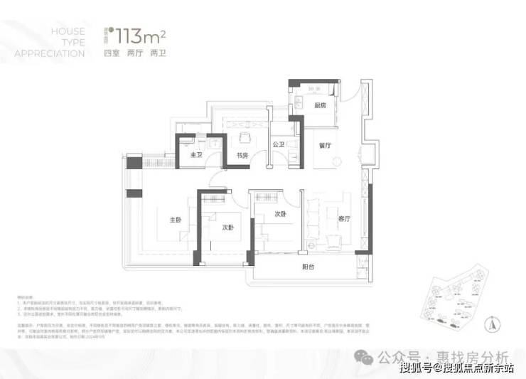 建面113平米:4房2厅2卫,传统的竖厅户型动静分区,‘S’型墙体,有冰箱预留位;市面非常常见的竖厅4房户型,比较突出的是有大阳台连接客厅和次卧;主卧和书房(卧室)都是多飘窗设计,保证了视野和多方面的采光;这种户型的缺点是走廊过长,空间利用率比横厅或者双龙抱珠户型差些;户型分布在5栋、6栋03/04户型,均是西南朝向,看小区外面大南山方向,比较安静;