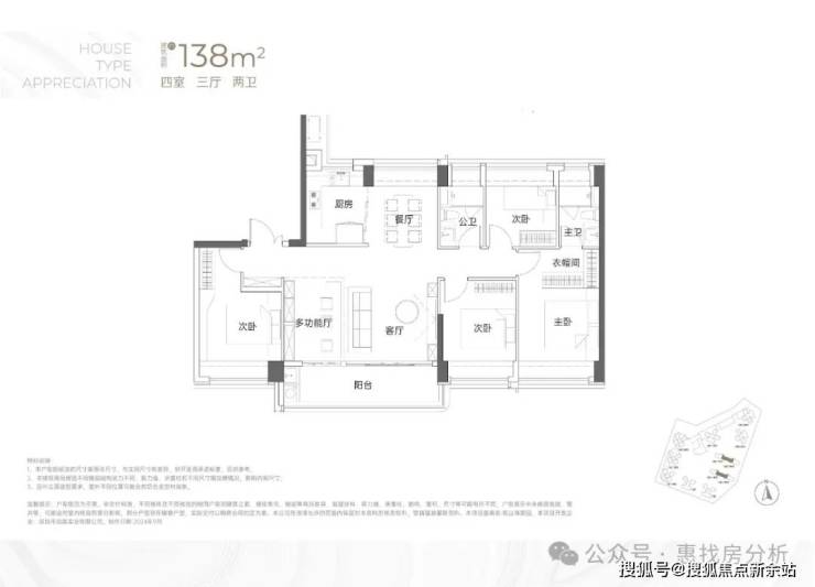 138㎡的4房2厅2卫:竖厅南北通透格局,专梯入户,客厅6.1米开间,LDKB一体化,全屋飘窗,4个卧室分别做到了3.9米/3.25米/2.9米/2.8米的宽度,主卧加1个次卧270°全景飘窗,客厅出6.1米长的大阳台,U型厨房,得房率约95-97%(包含赠送),阳台主朝西南向。138平米户型分布在3栋1单元、3栋2单元、4栋1单元、4栋2单,4个单元纯大户型。