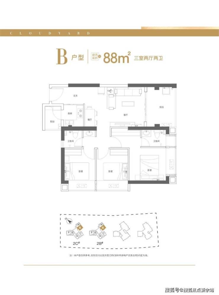 建面约88㎡三室两厅两卫