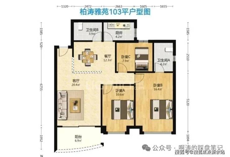 柏涛雅苑:建成于2001-2008年,38平一房至130平四房,贝壳近期成交价3.16万/平,中间面积103平户型为三房两卫。