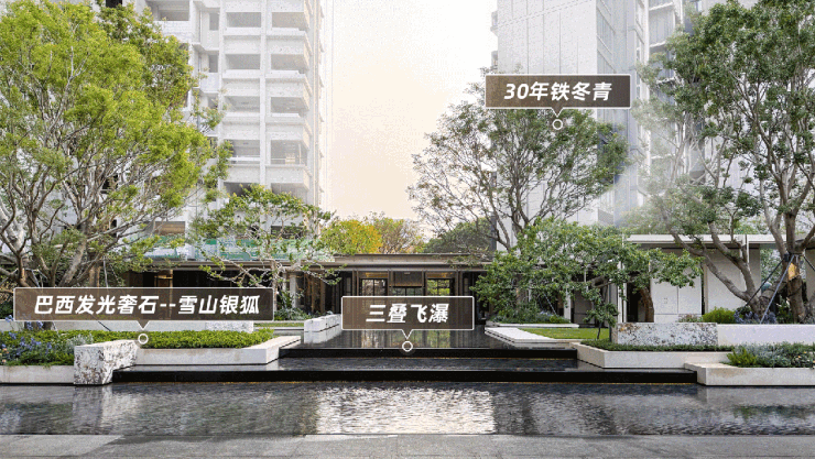 三进中心水院,当夜幕降临,水景两侧的巴西奢石呈现灯光下跳动的银,与背景叠水流动的光影交织奏鸣。