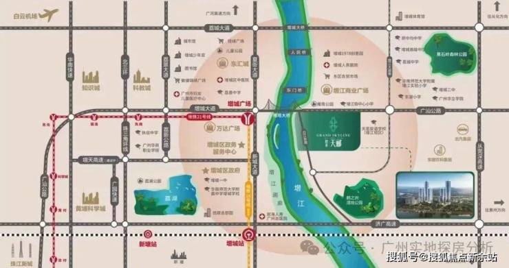 项目距离地铁21号线增城广场站约1.5公里,广汕公路、雁塔大桥、沿江东路等交通干道环绕,驾车可快速通达穗莞深城市群。
