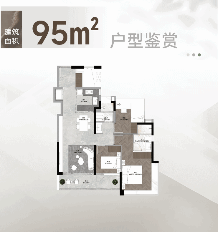 建面约95平户型,全屋做到三开间朝南,确保不同家庭成员的起居舒适度。