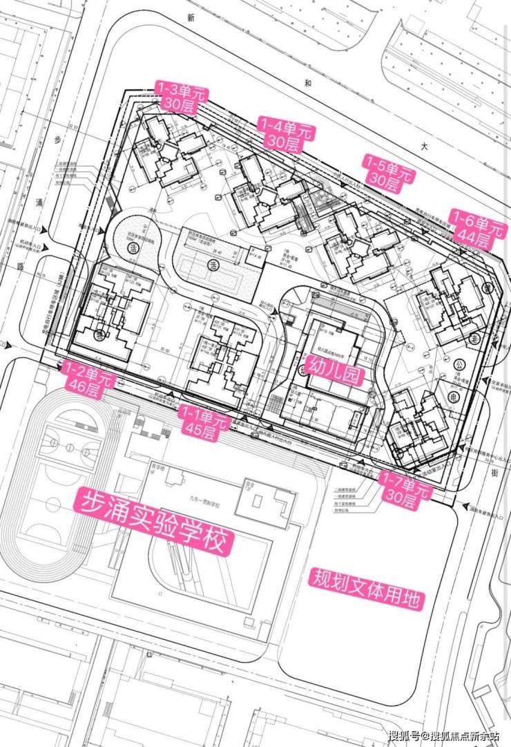 从规划平面图看,项目由7栋30-46层高层住宅和1栋幼儿园以及2层的裙楼商业配套组成,普通住宅户数为1543户,停车位2002个(含充电桩车位601个)。从平面图来看大概率是2梯6跟3梯7户设计,应该是中小刚需户型为主