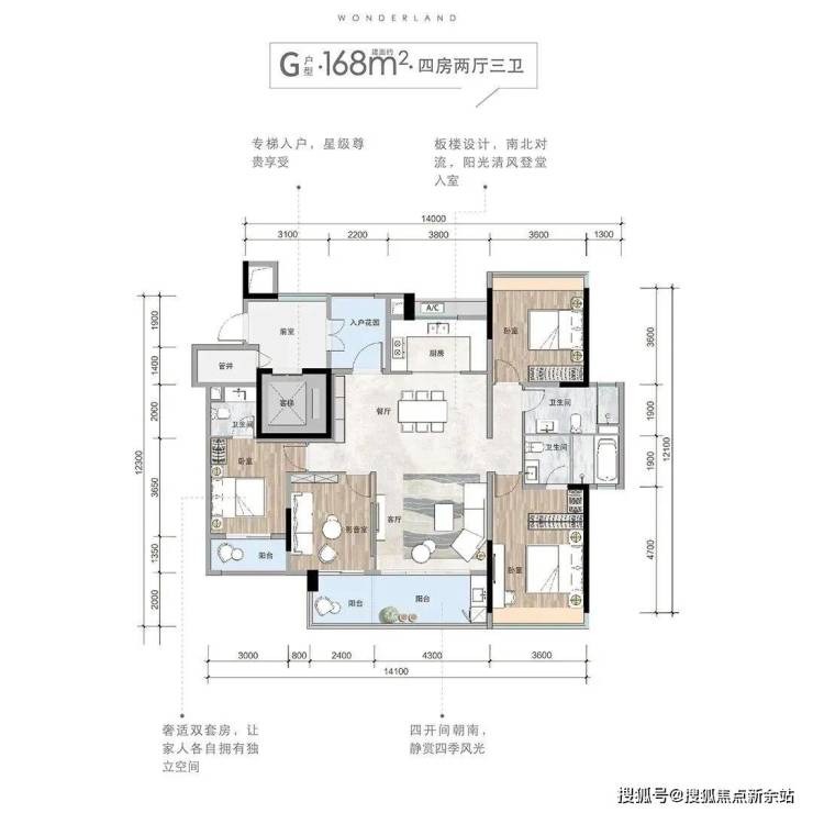 92-98㎡(2+1房两厅两卫)、143㎡(四房两厅两卫)、168㎡(四房两厅三卫)