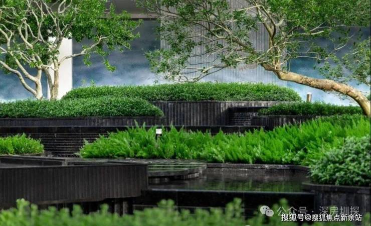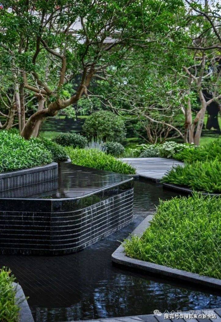 水流从入口叠水瀑布倾泻而下,奔向中央镜面水池,再沿着步道溪流蜿蜒流至全园各处,业主们沿着步道漫步,能依次体验 “听水的舒缓、观水的灵动、亲水的惬意”,这是传统平面园林没有的感受。
