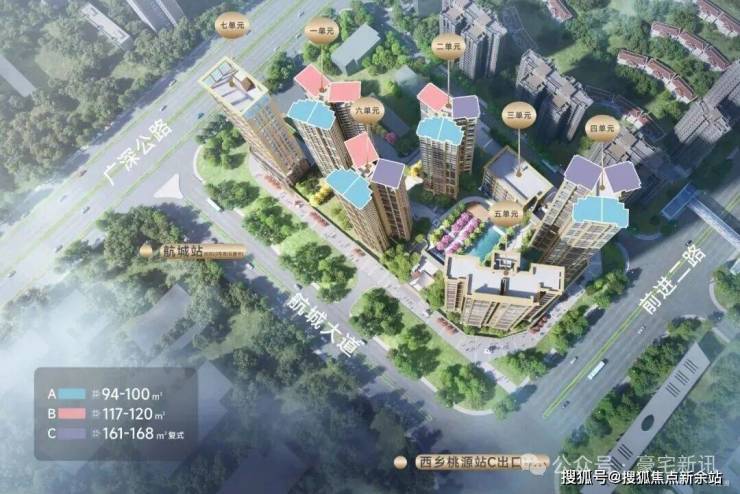 首先是区位出众、交通便捷。项目坐落于宝安西乡重点区域腹地,位于航城大道与前进二路交汇处,深圳地铁12号线西乡桃源站C出口可直达,距离建设中的地铁20号线二期航城站(预计2028年开通)仅一路之隔,而且规划中的地铁28号线也将在此换乘。项目尽享深圳西部交通枢纽优势,不仅拥有三地铁,而且临近机场、高铁、码头,周边还有多条高速环绕。