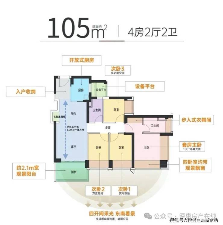 4开间东南向采光,赏碧道公园、看园林景观,主卧室通透双面采光,收纳更轻松,S型墙体设计冰箱位,空间利用更合理,2个卫生间方正格局,有飘窗更省空间。