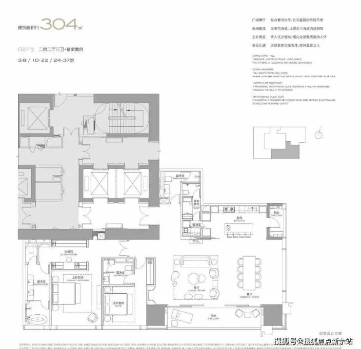 南北通透三面采光,顶奢总统套房规格,270°全景套房,享受湿地/公园/CBD景观,都是套房设计,更具私密性,中西厨分离。