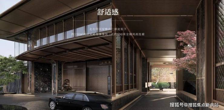 以星级酒店打造手法,形成约150㎡环岛落客区,搭配约200米全域风雨连廊,出入皆为礼宾级待遇;
