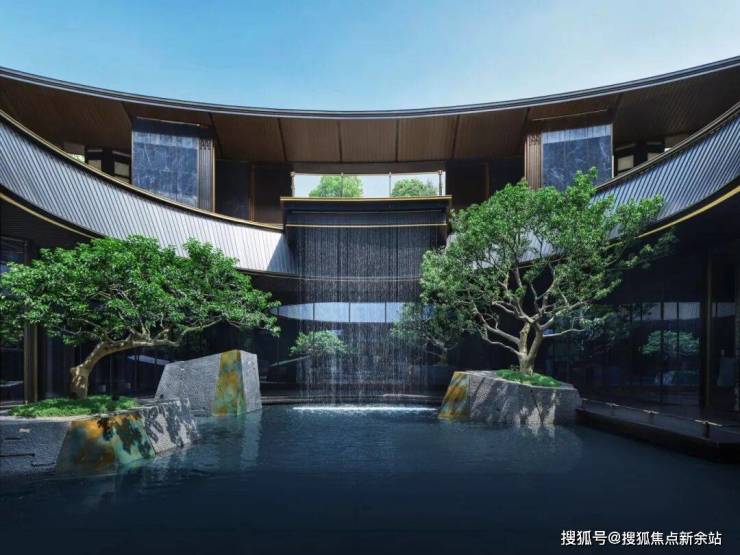 叠石流瀑,形成“四水归堂”格局,意在水聚天心;松树傲立,寓意吉祥幸福。