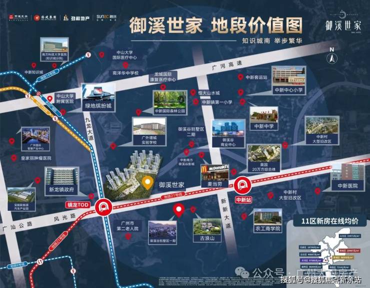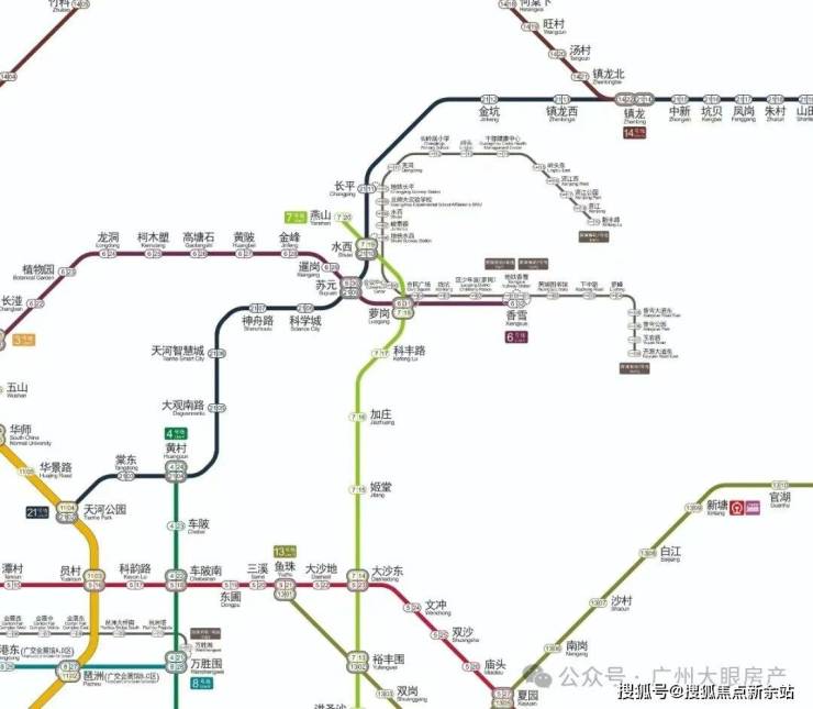 这个楼盘属于在两个地铁站中间,距离地铁21号线中新站(约1000米)、地铁14/21号线镇龙站(约900米),在这个楼盘坐地铁的话,建议直接去镇龙站,可以选择坐快线,3站到天河