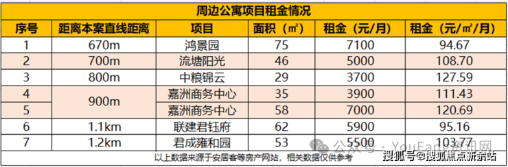 目前距离本项目约700m的45㎡产品的月租金可达5000元,同时周边73㎡产品的月租金可达7000元。
